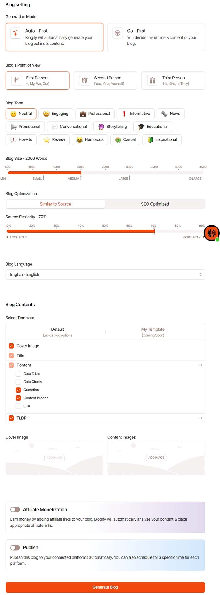 Blogify’s user-friendly interface is one of its standout features. It caters to users at all technical levels, making it easy to navigate through various functionalities. This simplicity allows even those without much writing experience to create blog content effectively. Another major strength is its content repurposing capability. By allowing users to transform existing content, like YouTube videos or podcasts, into blog posts, Blogify saves time and effort. Additionally, the AI-powered content generation is impressive; it produces coherent and contextually relevant articles, which is vital for maintaining reader engagement.